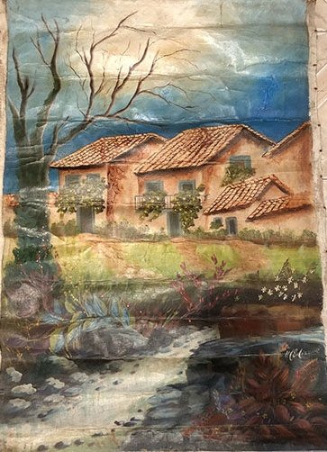 3 CASAS CON TEJA DE BARRO ARBOL SIN HOJAS Y RIACHUELO