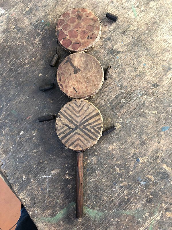 PIEZAS , INSTRUMENTO , PEQUE?O, EN CUERO Y MADERA, MOTIVO 3 TAMBORINES EN UNO CON 6 PESTA?AS QUE HACEN SONAR , ELABORADO EN MADERA Y CUERO, DIMENSIONES: X X , PESO: GRS