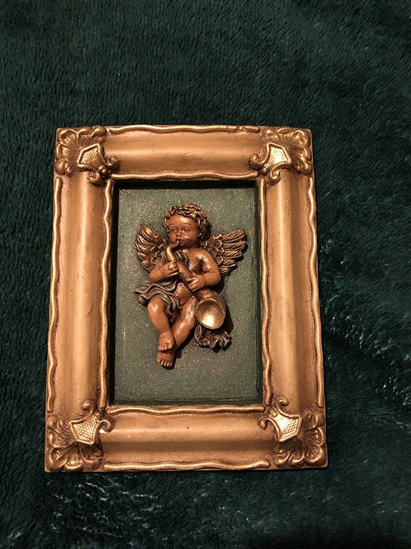 ICONOS , CUADRO, PEQUE?O, SOBRE MADERA , MOTIVO ANGEL CON SAXOFON EN RECINA , ELABORADO EN MADERA, DIMENSIONES: X X , PESO: GRS