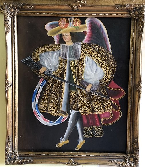 CUADROS, OLEO, MEDIANO, OLEO SOBRE TELA , MOTIVO ARCANGEL CON ESCOPETA CON LA CACHA AL REVES, ELABORADO EN LIENZO Y MADERA, DIMENSIONES: X X , PESO: GRS