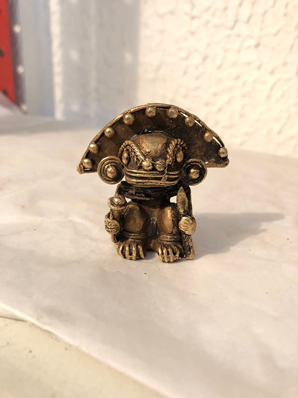 PIEZAS , FIGURAS, PEQUE?O, ORO -COBRE-PLATA Y BRONCE – CULTURA SAN AGUSTIN HUILA – MU?ECO CHAMAN , MOTIVO BASTON DERECHA PLUMA EN IZQUIERDA , ELABORADO EN PD, DIMENSIONES: X X , PESO: GRS
