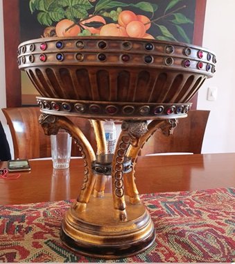 ANTIGUE, CENTROS DE M, GRANDE, CENTRO DE MESA, FRUTERO, MOTIVO CENTRO DE MESA, FRUTERO EN MADERA, INCRSTACIONES EN PIEDRAS SEMIPRECIOSAS, DOS PIEZAS, ELABORADO EN MADERA, DIMENCIONES: X X , PESO: GRS