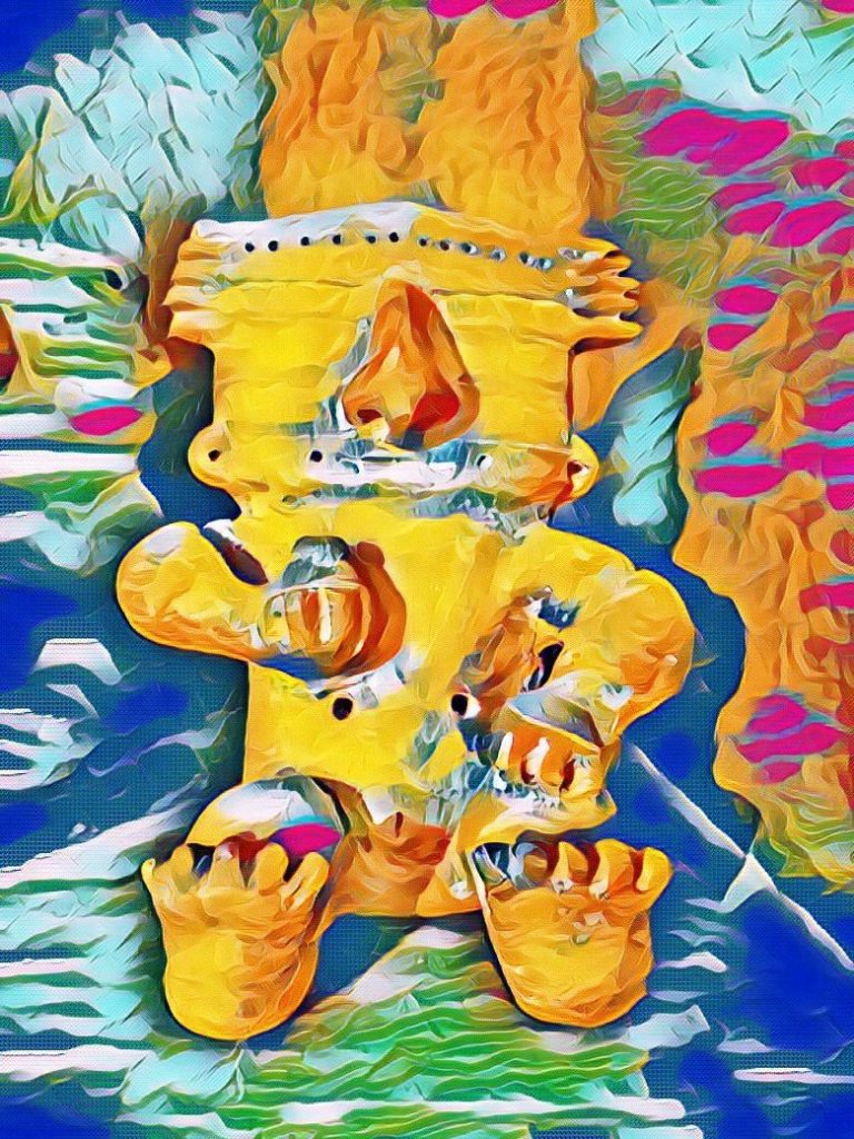 Sancho Panza, en contraste, es compacto, redondo y cálido. Su expresión es bonachona, casi pícaramente cómplice. Sostiene una bota de vino, símbolo de la tierra, del goce sencillo, del arraigo. Su vestuario, ejecutado con la misma precisión técnica, resalta los tonos terrosos y cálidos, generando un equilibrio cromático que contrasta y dialoga con el aura dorada y más etérea de Don Quijote.