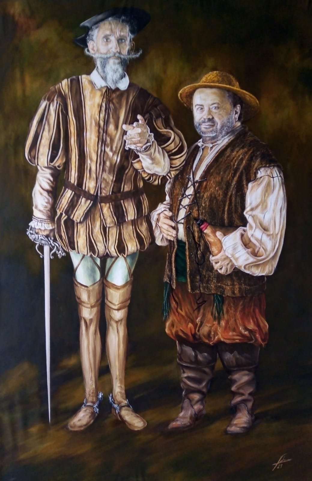 Don Quijote aparece estilizado, alargado, con su mirada firme y melancólica, evocando el romanticismo de los sueños imposibles. Su indumentaria es rica en detalles renacentistas, con un manejo preciso de las texturas: terciopelos, pliegues, reflejos metálicos y transparencias en los pantys celestes que acentúan su fragilidad física frente a la grandeza de su espíritu. La espada en mano y el gesto de la mano al frente lo sitúan como un guía, un pensador, un líder cuya batalla es interior y universal.