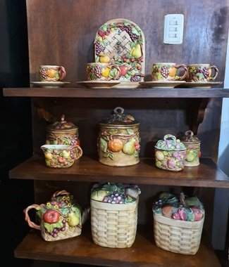 ADORNOS, RECIPIENTES , MEDIANO, VAJILLA DECORATIVA EN CERAMICA, MOTIVO ESPECTACULAR VAJILLA ARTESANAL PINTADA A MANO, 17 PIEZAS INCLUIDO RELOJ FUNCIONAL., ELABORADO EN CERAMICA, DIMENCIONES: X X , PESO: GRS