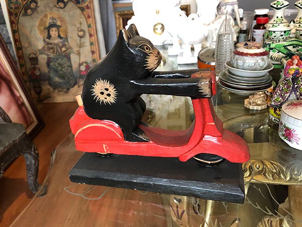 ADORNOS, FIGURA, MINI, EN MADERA , MOTIVO GATO NEGRO SOBRE MOTO, ELABORADO EN MADERA , DIMENSIONES: X X , PESO: GRS