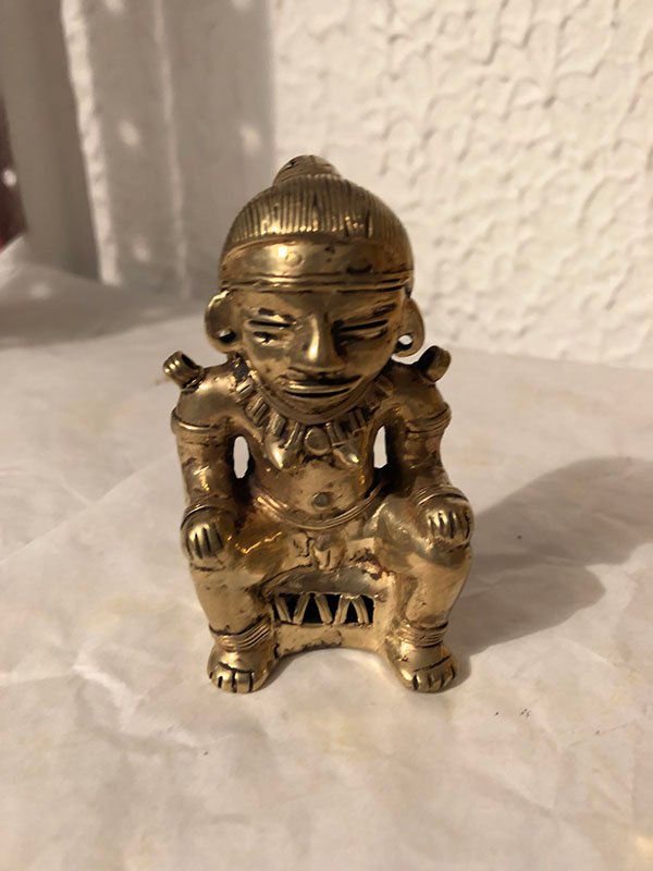 PIEZAS , FIGURA, PEQUE?O, ORO -COBRE-PLATA Y BRONCE – CULTURA SAN AGUSTIN HUILA – INDIA ORANDO, MOTIVO GUERRERO CON MO?O COGIENDOSE LAS RODILLAS, ELABORADO EN PD, DIMENSIONES: X X , PESO: GRS
