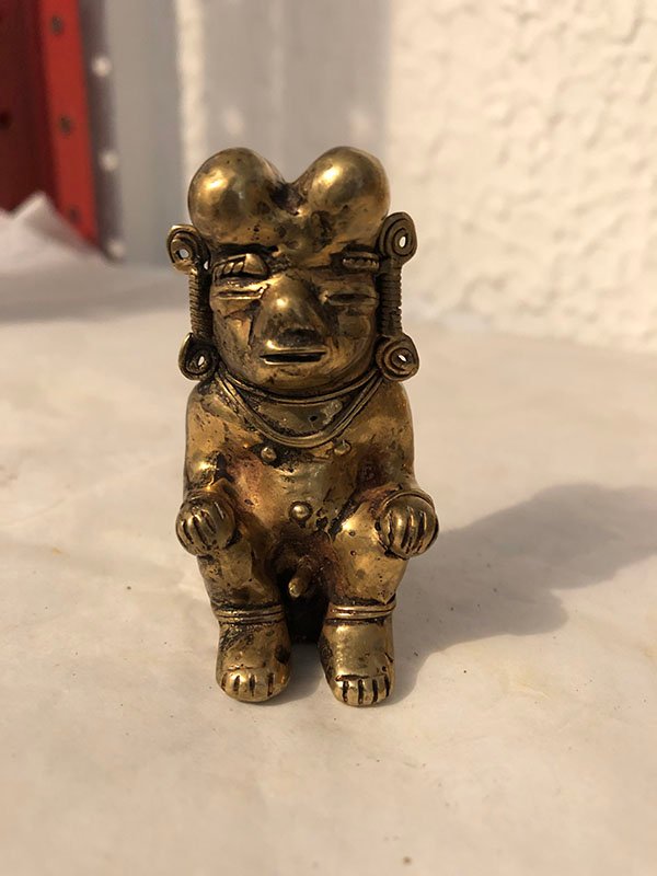 PIEZAS , FIGURAS, PEQUE?O, ORO -COBRE-PLATA Y BRONCE – CULTURA QUIMBAYA – MU?ECO POPORO , MOTIVO INDIGENA CON 4 BOLAS EN LA CABEZA , ELABORADO EN TUMBAGA, DIMENSIONES: X X , PESO: GRS