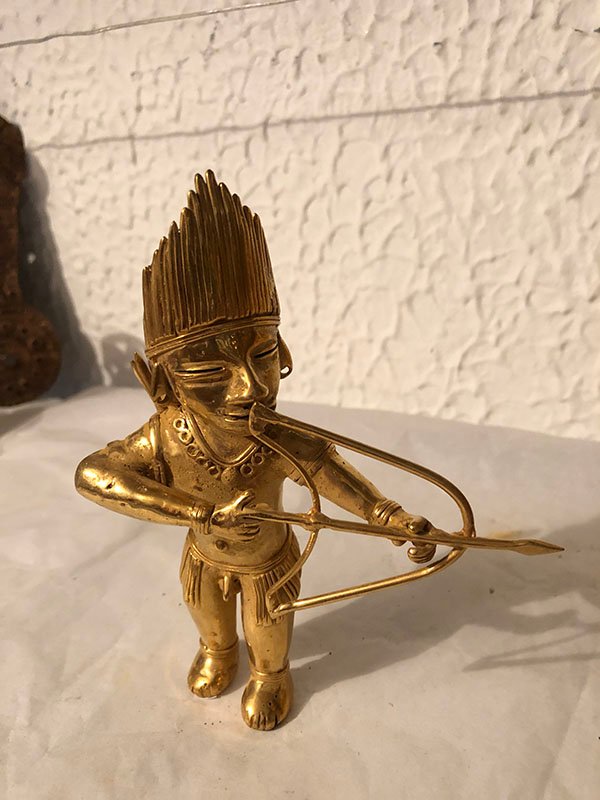 PIEZAS , FIGURA, MEDIANO, ORO -COBRE-PLATA Y BRONCE – CULTURA SAN AGUSTIN HUILA – CAZADOR, MOTIVO INDIGENA CON ARCO Y FLECHA, ELABORADO EN TUMBAGA, DIMENSIONES: X X , PESO: GRS