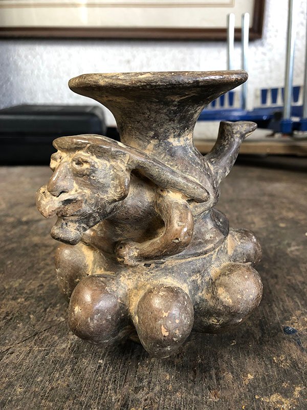 PIEZAS , OTROS, MEDIANO, ARCILLA – CULTURA CORINTO – UN CANTARO CON INDIO ACOSTADO, MOTIVO INDIO ACOSTADO SOBRE BOLAS Y EN EL MEDIO RECIPIENTE , ELABORADO EN ARCILLA, DIMENSIONES: X X , PESO: GRS
