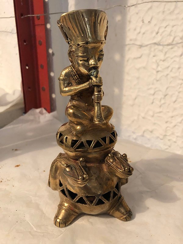 PIEZAS , FIGURA, MEDIANO, ORO -COBRE-PLATA Y BRONCE – CULTURA SAN AGUSTIN HUILA – URNA FUNERARIA, MOTIVO INDIO CON FLAUTA SOBRE 2 SERPIENTES, ELABORADO EN PD, DIMENSIONES: X X , PESO: GRS