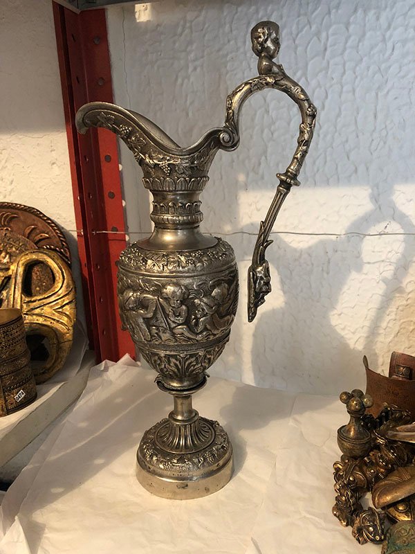 ANTIGUE, JARRA, GRANDE, EN ELECTRO PLATA – DINASTIA MING, MOTIVO JARRA DE VINO EN PLATA CON NI?O EN LA MANIJA , ELABORADO EN ELECTROPLATA, DIMENSIONES: X X , PESO: GRS