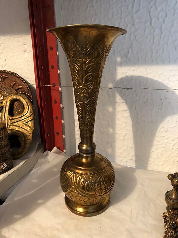 ANTIGUE, JARRON FLORE, GRANDE, EN BRONCE – FLORERO , MOTIVO JARRON BASE EN BOLA DORADA Y CUELLOO DELGADO , ELABORADO EN BRONCE, DIMENSIONES: X X , PESO: GRS