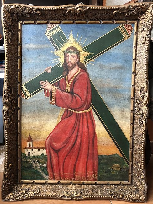 CUADROS, OLEO, GRANDE, JESUCRISTO LLEVANDO LA CRUZ – OLEO SOBRE TELA, MOTIVO JESUS LLEVANDO LA CRUZ VERDE, ELABORADO EN LIENZO Y MADERA, DIMENSIONES: X X , PESO: GRS