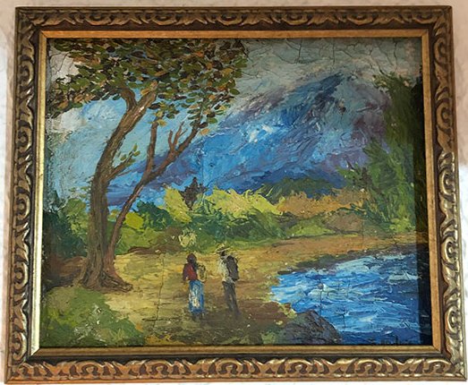 CUADROS, OLEO, PEQUE?O, SEGUNDO AGELVIS – OLEO SOBRE TELA , MOTIVO LAGO, DOS CAMINANTES MONTA?A AZUL ARBOL DOS RAMAS, ELABORADO EN LIENZO Y MADERA, DIMENSIONES: X X , PESO: GRS
