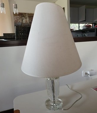 ADORNOS, LAMPARAS, GRANDE, LAMPARA DE MESA BASE EN CRISTAL, MOTIVO LAMPARA DE MESA, BASE EN CRISTAL, CAPERUZA BLANCA EN LINO, ELABORADO EN CRISTAL METAL Y TELA, DIMENCIONES: X X , PESO: GRS