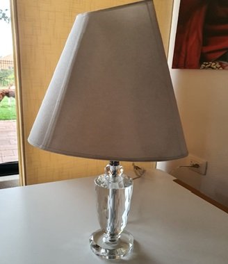 ADORNOS, LAMPARAS, GRANDE, LAMPARA DE MESA BASE EN CRISTAL, MOTIVO LAMPARA DE MESA, BASE EN CRISTAL, CAPERUZA BLANCA EN LINO, ELABORADO EN CRISTAL METAL Y TELA, DIMENCIONES: X X , PESO: GRS