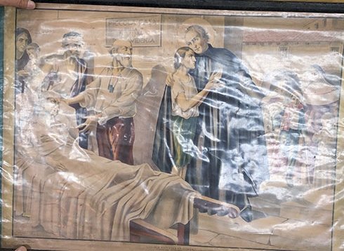 CUADROS, LITOGRAFIA, MEDIANO, PAPEL SOBRE TELA , MOTIVO LEYENDAS BIBLICAS PINTADOS EN PAPEL SOBRE TELA EN CUARTO DE ENFERMO , ELABORADO EN PAPEL, DIMENSIONES: X X , PESO: GRS