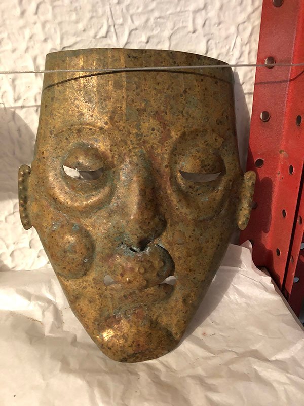 PIEZAS , MASCARA , MEDIANO, ORO -COBRE-PLATA – CULTURA DE SAN AGUSTIN HUILA, MOTIVO MASCARA CON OJOS MEDIO ABIERTOS, ELABORADO EN BRONCE, DIMENSIONES: X X , PESO: GRS