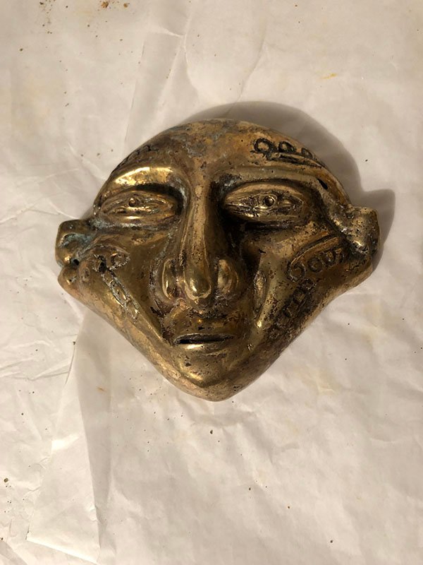 PIEZAS , MASCARA , PEQUE?O, ORO -COBRE-PLATA Y BRONCE – CULTURA SAN AGUSTIN HUILA , MOTIVO MASCARA DE CALVO Y NARIZON , ELABORADO EN PD, DIMENSIONES: X X , PESO: GRS