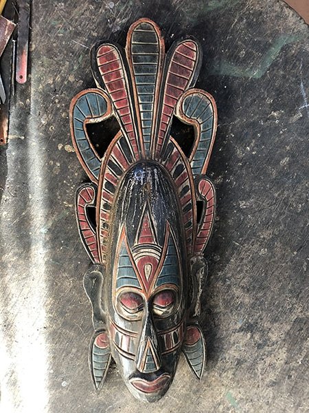 MASCARA DE COLGAR CONTRA LA PARED EN MADERA ROJO CON AZUL