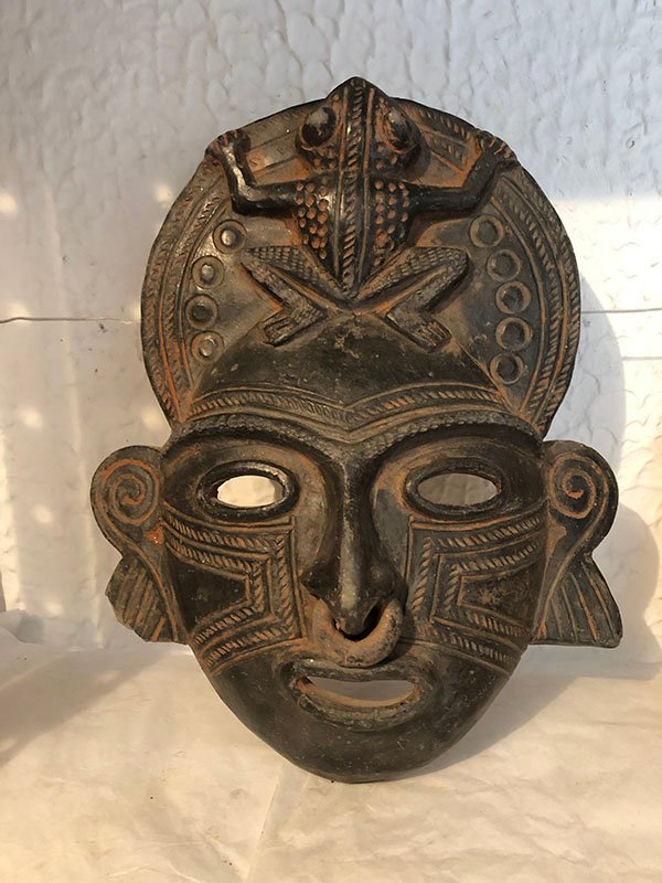 PIEZAS , MASCARA , GRANDE, EN ARCILLA – CULTURA TAYRONA – CARNAVALES , MOTIVO MASCARA DE MUJER CON NARIGUERA Y RANA EN LA CORONA , ELABORADO EN ARCILLA, DIMENSIONES: X X , PESO: GRS