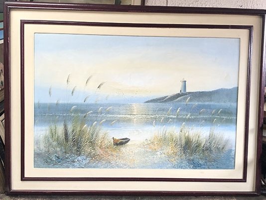 BARCA EN LA ORILLA AL FONDO UN FARO