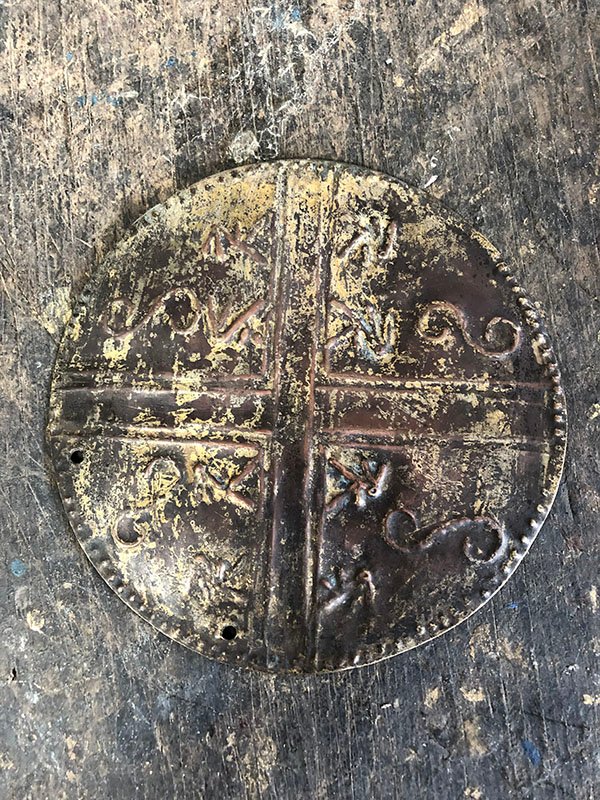 PIEZAS , FIGURA, MEDIANO, ORO -COBRE-PLATA Y BRONCE – CULTURA TOLIMA – PECTORAL CON GEROGLIFICOS, MOTIVO MONEDA GRANDE CON FIGURINES , ELABORADO EN PD, DIMENSIONES: X X , PESO: GRS