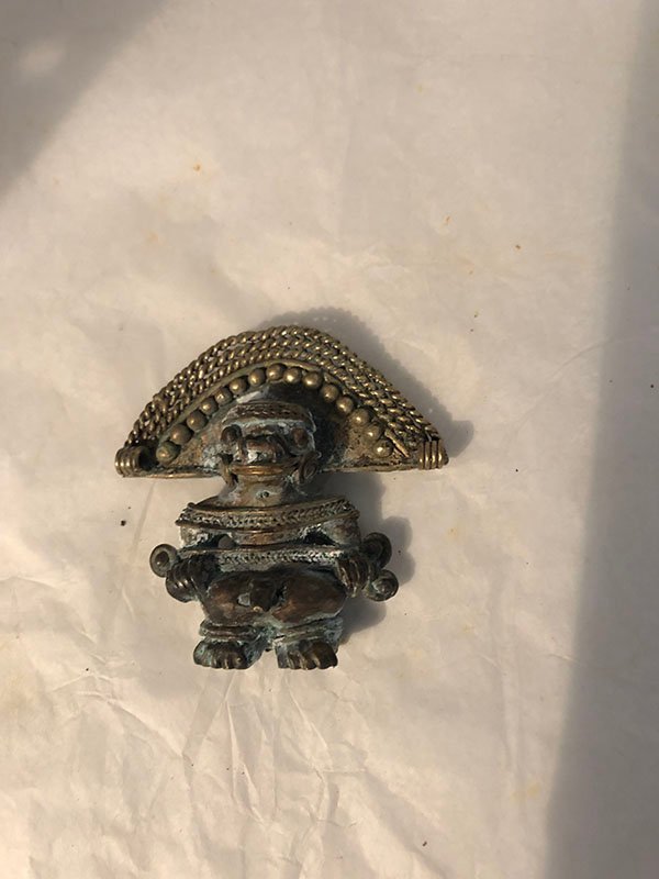 PIEZAS , FIGURAS, PEQUE?O, ORO -COBRE-PLATA Y BRONCE – CULTURA TAYRONA – CHAMAN , MOTIVO MU?ECO CON SOMBRERO ANCHO CON BOLITAS EN EL , ELABORADO EN PD, DIMENSIONES: X X , PESO: GRS