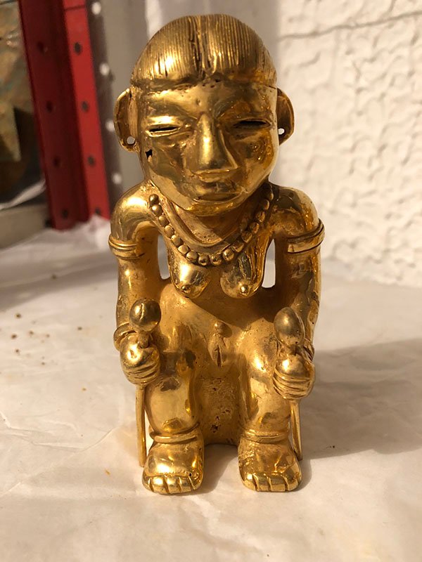 PIEZAS , FIGURA, PEQUE?O, ORO -COBRE-PLATA Y BRONCE – CULTURA DE TIERRA ADENTRO – MUJER CHAMANA, MOTIVO MUJER CON DOS BASTONES DE MANDO, ELABORADO EN TUMBAGA, DIMENSIONES: X X , PESO: GRS