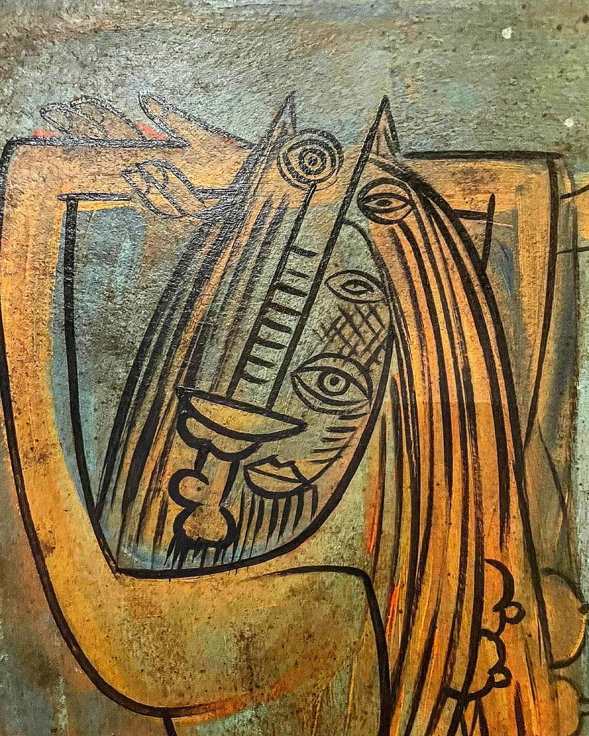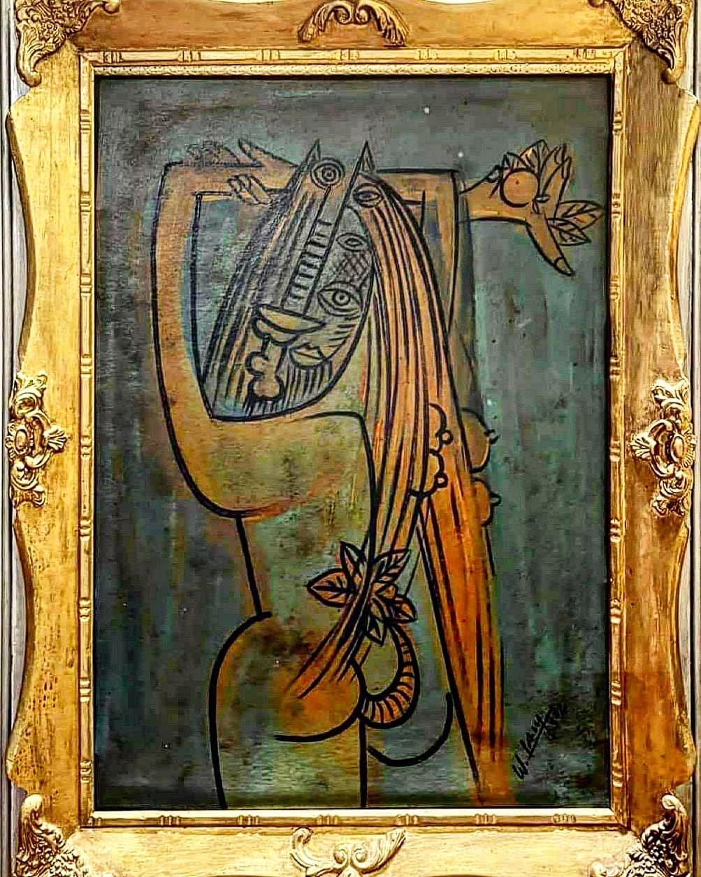 CUADROS, OLEO, GRANDE, WIFREDO LAM / 1942 – OLEO SOBRE TELA, MOTIVO FIGURA FEMENINA DE ESPALDAS CON FLOR EN EL CABELLO, ELABORADO EN LIENZO, MARCO MADERA ESTILO CLASICO, DIMENSIONES EXTERNAS: 70X50 CM