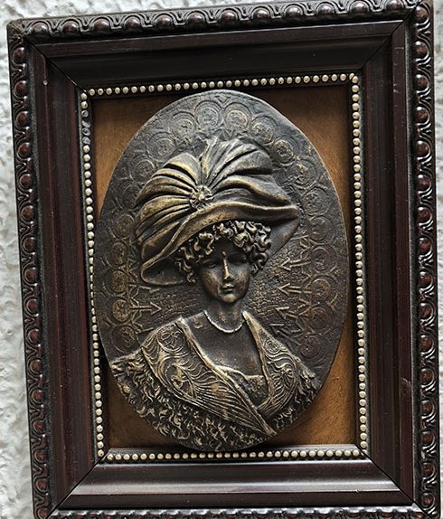 ADORNOS, CUADRO DECOR, MEDIANO, EN RECINA , MOTIVO MUJER FRANCESA ENMARCADA EN MADERA, ELABORADO EN MADERA Y RECINA, DIMENSIONES: X X , PESO: GRS