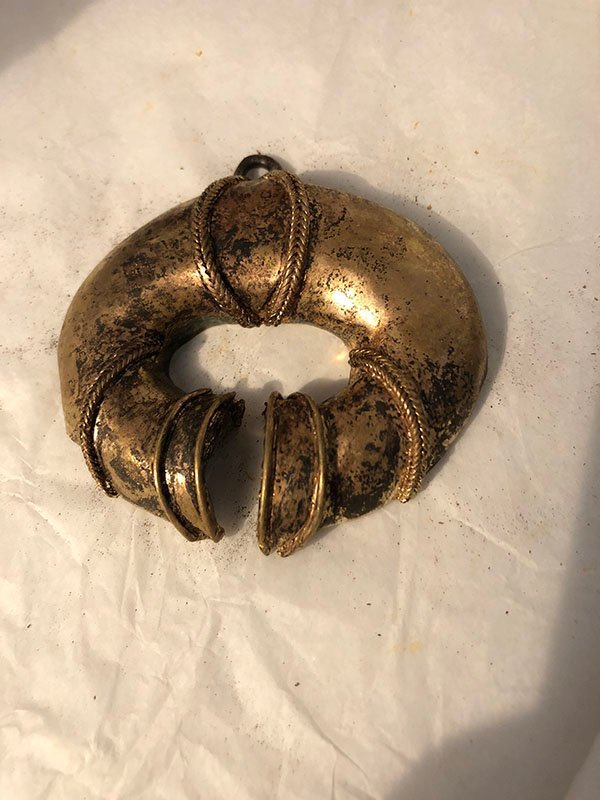PIEZAS , PIEZA ORFEBR, PEQUE?O, ORO -COBRE-PLATA Y BRONCE – CULTURA TAYRONA – DIJE, MOTIVO NARIGUERA EN FORMA DE FRIJOL CON CUERDA DORADA EN EL CENTRO, ELABORADO EN PD, DIMENSIONES: X X , PESO: GRS