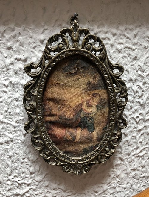 ADORNOS, CAMAFEOS, PEQUE?O, OLEO SOBRE TELA , MOTIVO NI?O CON CUCHILLO Y CARGANDO PAJA , ELABORADO EN BRONCE Y SEDA, DIMENSIONES: X X , PESO: GRS