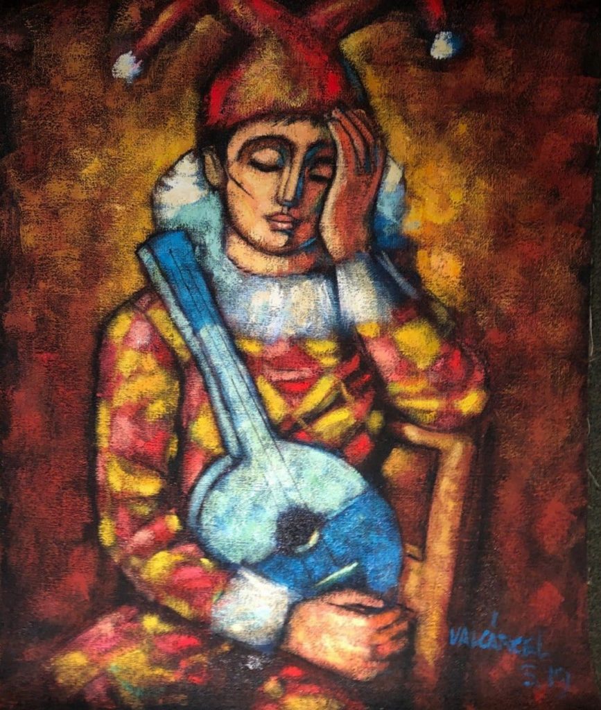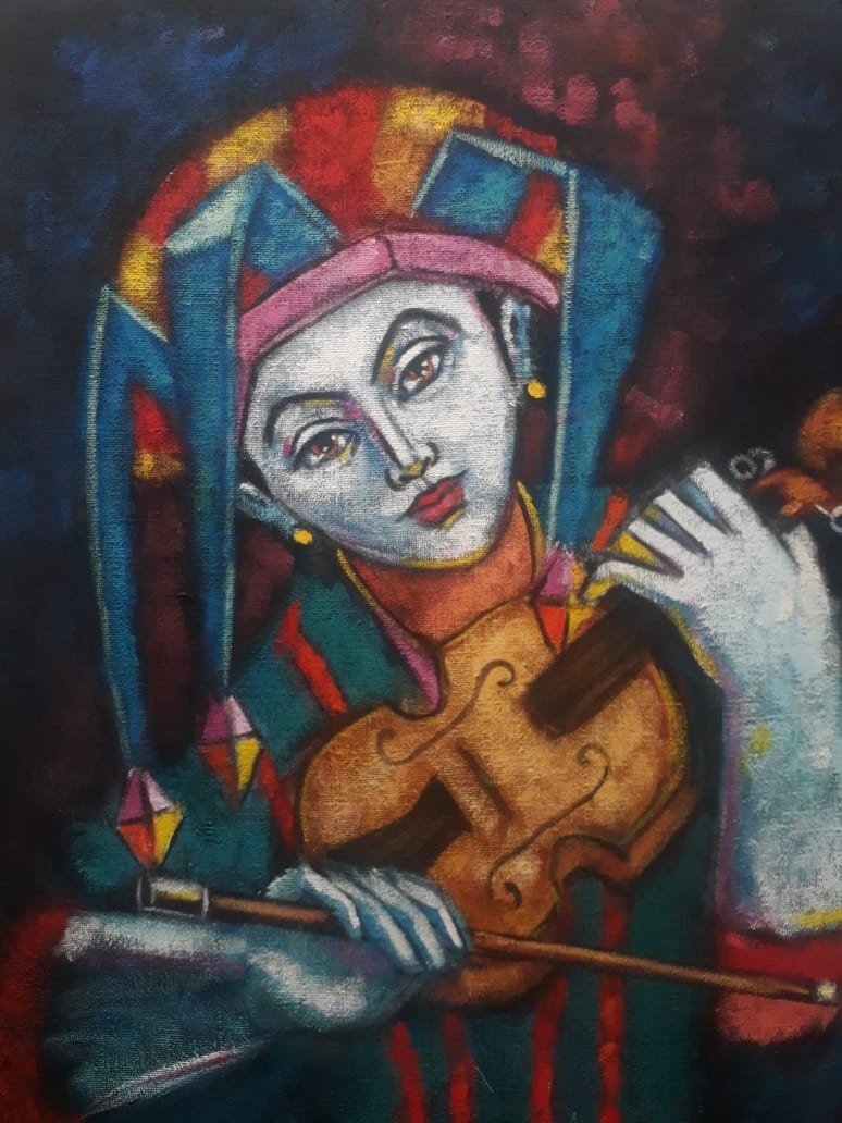 CUADROS, OLEOS, GRANDE, OLEO SOBRE YUTE, ALVARO VALCARCEL, MOTIVO ARLEQUIN EL VIOLINISTA, ELABORADO EN OLEO YUTE, DIMENCIONES: X X , PESO: GRS