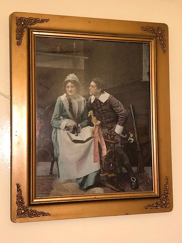 CUADROS, OLEO, PEQUE?O, MARCO DORADO , MOTIVO PAREJA ELLA ESCRIBE EN UN LIBRO Y SU PIE SOBRE UNA RUECA , ELABORADO EN PD, DIMENSIONES: X X , PESO: GRS