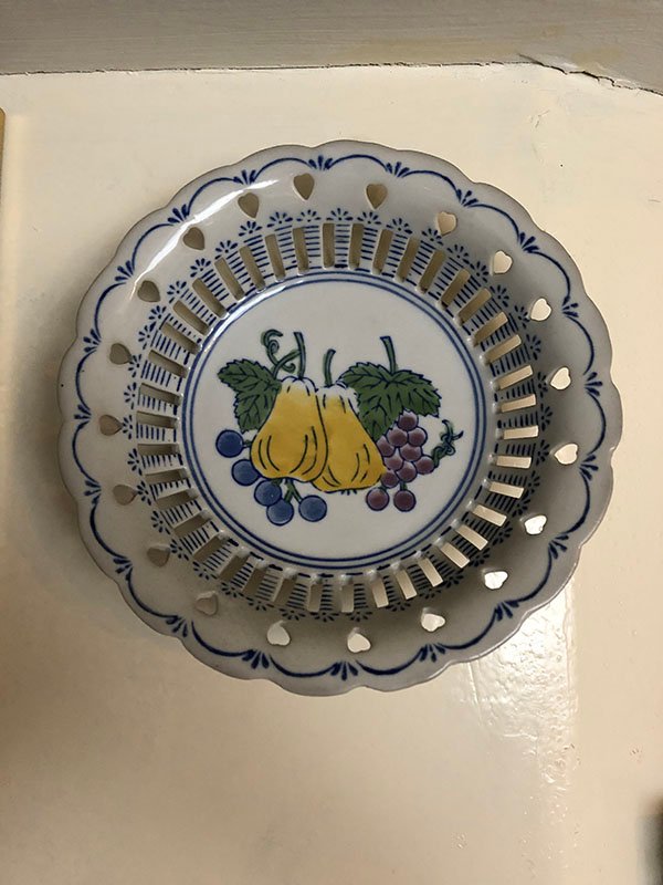 ADORNOS, PLATO DECORA, MEDIANO, EN PORCELANA , MOTIVO PERAS AMARILLAS Y UVAS MORADAS Y AZULES, ELABORADO EN PORCELANA, DIMENSIONES: X X , PESO: GRS