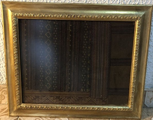 CUADROS, TEXTIL, MEDIANO, TEXTIL INDIGENA – CULTURA MUISCA, MOTIVO TELARES CON MARCO DORADO , ELABORADO EN TEXTIL, DIMENSIONES: X X , PESO: GRS