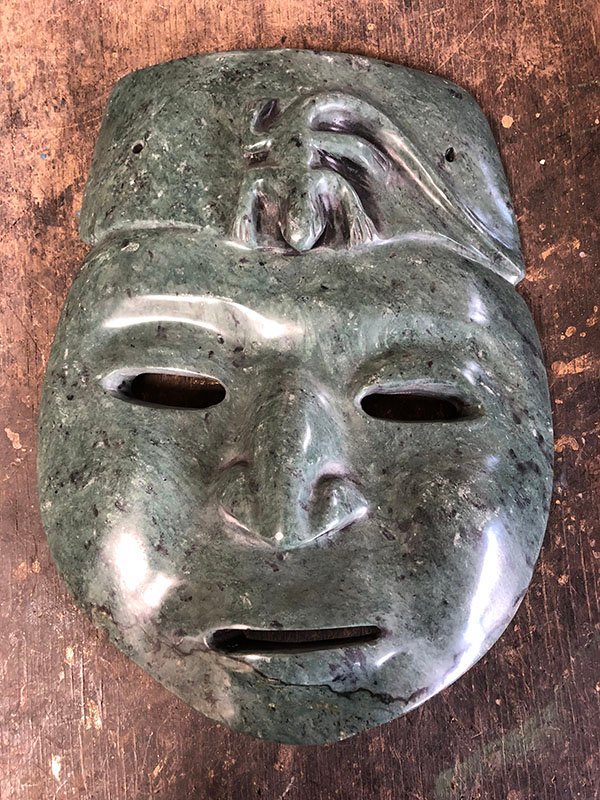 PIEZAS , MASCARA , GRANDE, EN JADE – CULTURA NARI?O QUILLASINGA – MASCARA DE CARNAVAL, MOTIVO VERDE MUY GRANDE CON LAGARTIJA EN LA FRENTE , ELABORADO EN JADE, DIMENSIONES: X X , PESO: GRS