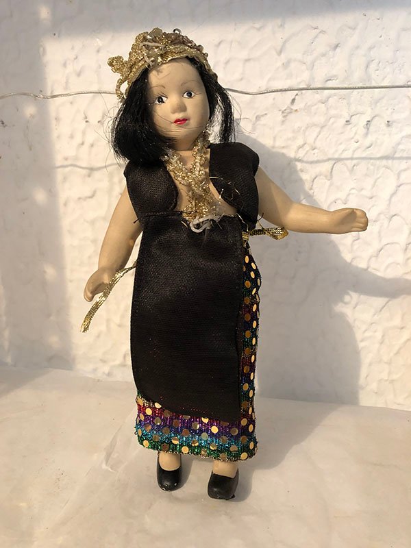ADORNOS, MU?ECO, MEDIANO, EN TELA Y PORCELANA , MOTIVO VESTIDO NEGRO BORDADO CON COLORINES , ELABORADO EN TELA, DIMENSIONES: X X , PESO: GRS