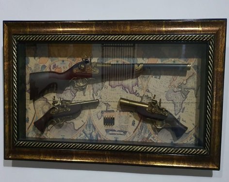 ADORNOS, COLLAGE, GRANDE, VITRINA COLLAGE DE ARMAS ANTIGUAS, MOTIVO VITTRINA COLLAGE DE ARMAS ANTIGUAS, REPLICAS., ELABORADO EN MADERA, BRONCE Y VIDRIO, DIMENCIONES: X X , PESO: GRS