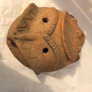 PIEZAS , OTRAS, PEQUE?O, EN ARCILLA - CULTURA TAYRONA - PITO UTILIZADO EN LOS BAILES TIPICOS DE LA COMUNIDAD , MOTIVO FLAUTA CON CARA DE DEMONIO Y PEINADO LARGO HACIA ARRIBA , ELABORADO EN ARCILLA, DIMENSIONES: X X , PESO: GRS