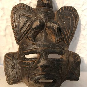 PIEZAS , MASCARA , PEQUE?O, EN ARCILLA - CULTURA TAYRONA - MASCARA MURCIELAGO, MOTIVO MARCARA CON OREJAS CUADRADAS AVE EN LA CABEZA CON DOS PRESAS DE POLLO , ELABORADO EN ARCILLA, DIMENSIONES: X X , PESO: GRS