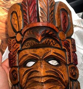 ADORNOS, MASCARAS, MEDIANO, MASCARA INDIGENA, MOTIVO MASCARA INDIGENA TALLADA EN MADERA, GORRO Y TRENSAS, ELABORADO EN MADERA, DIMENCIONES: X X , PESO: GRS