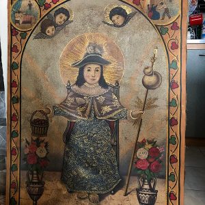 CUADROS, OLEO, GRANDE, PATRONA DE UN PUEBLO DEL PERU - OLEO SOBRE TELA, MOTIVO VIRGEN CON NI?O JESUS PEQUE?O Y DOS FLOREROS VERDES, ELABORADO EN LIENZO Y MADERA, DIMENSIONES: X X , PESO: GRS