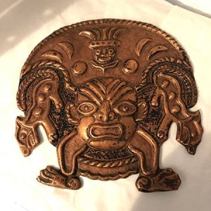 PIEZAS , FIGURAS, MEDIANO, ORO -COBRE-PLATA Y BRONCE - CULTURA CORINTO - PECTORAL DE CHAMAN , MOTIVO ROSTRO CON DOS PATAS Y MANOS CON CARAS DE PERRO , ELABORADO EN COBRE, DIMENSIONES: X X , PESO: GRS