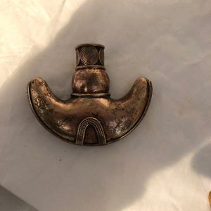 PIEZAS , PIEZA ORFEBR, PEQUE?O, ORO -COBRE-PLATA Y BRONCE - CULTURA TAYRONA - DIJE, MOTIVO RI?ON CON BOLITAS EN ESPIRAL EN LA PARTE SUPERIOR , ELABORADO EN PD, DIMENSIONES: X X , PESO: GRS