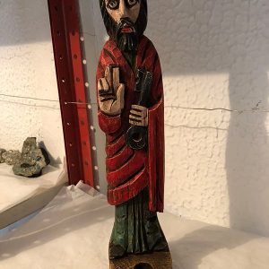 ICONOS , FIGURA, MEDIANO, EN MADERA - PINTADA A MANO, MOTIVO SAN JOSE CON CAPA ROJA OJOS TRASNOCHADOS , ELABORADO EN MADERA, DIMENSIONES: X X , PESO: GRS