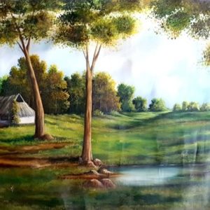 CUADROS, OLEOS, GRANDE, OLEO SOBRE LIENZO, MOTIVO PAISAJE, CABA¥A CAMPESINA, PRADERA Y PEQUE¥O LAGO, ELABORADO EN OLEO SOBRE LIENZO, DIMENCIONES: X X , PESO: GRS
