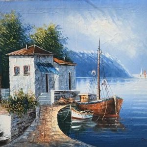 CUADROS, OLEOS, PEQUE¥O, OLEO SOBRE LIENZO, MOTIVO PAISAJE COLONIAL, MARINA CASA Y BARCA , ELABORADO EN OLEO SOBRE LIENZO, DIMENCIONES: X X , PESO: GRS